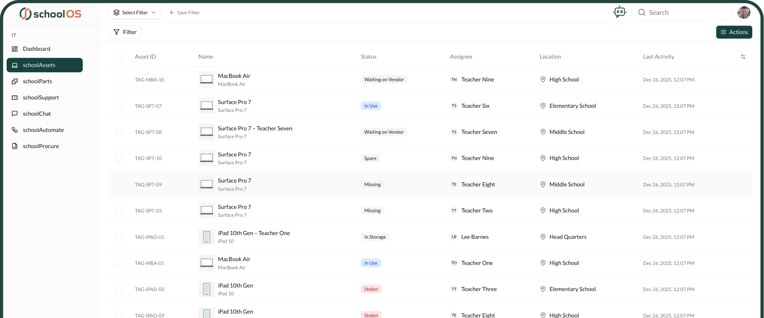 Get a single system of record for devices, warranties, vendors and lifecycle history with schoolAssets, a forever-free K-12 asset management system built for district technology teams.